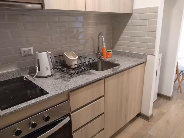 Departamento Studio con Balcón, full equipado con TV, con Wifi, Baño privado, cocina americana, cama de dos plazas y disponemos de un colchón inflable individual si requieren una tercera persona por $10.000 adicionales, sin toallas de cuerpo.